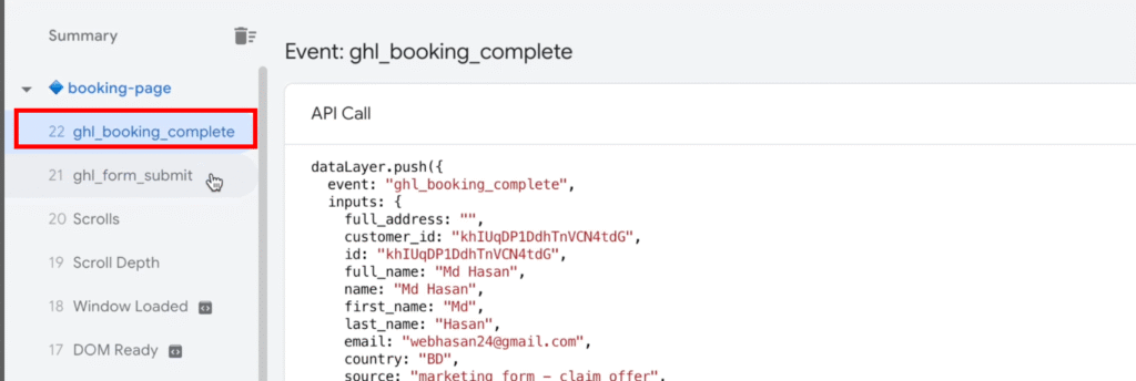 Similarly, if your website has a booking form, submitting it will show a DataLayer event named ghl_booking_complete in the GTM preview.