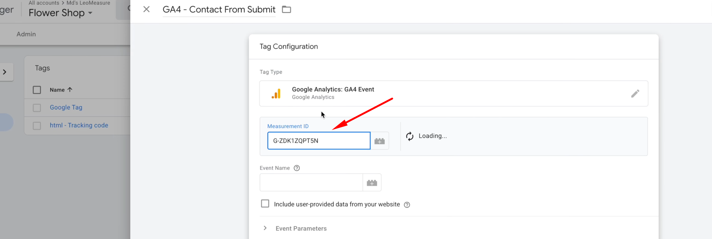 Click on the “Tag Configuration” area and select “Google Analytics: GA4 Event.” Then, copy your Measurement ID from Google Analytics and paste it into the “Measurement ID” field. In the “Event Name” field, enter a name for your event, for example: contact_form_submit.