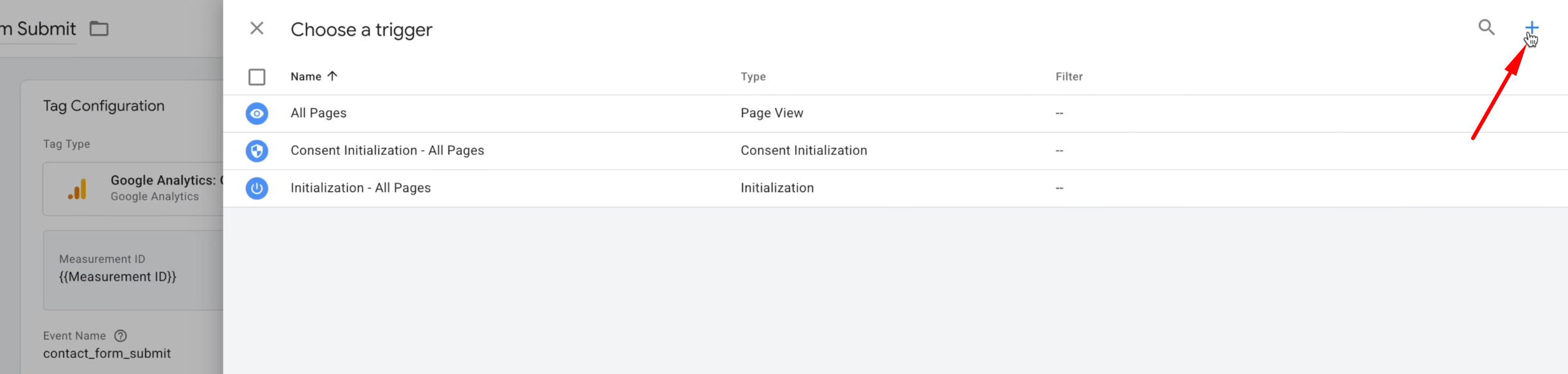 For the trigger, select the previously created “Contact Form Submit” trigger.