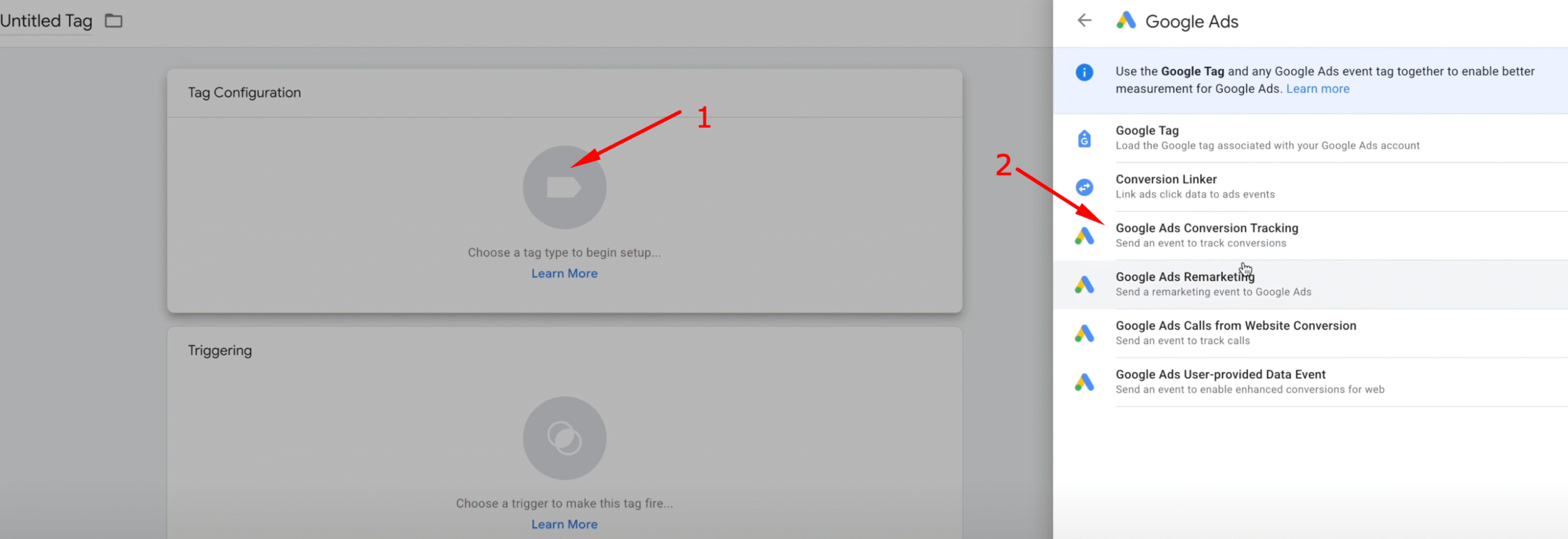 Just like the Google Analytics tag, we need to create a Google Ads tag to send tracking data to the Google Ads platform.
