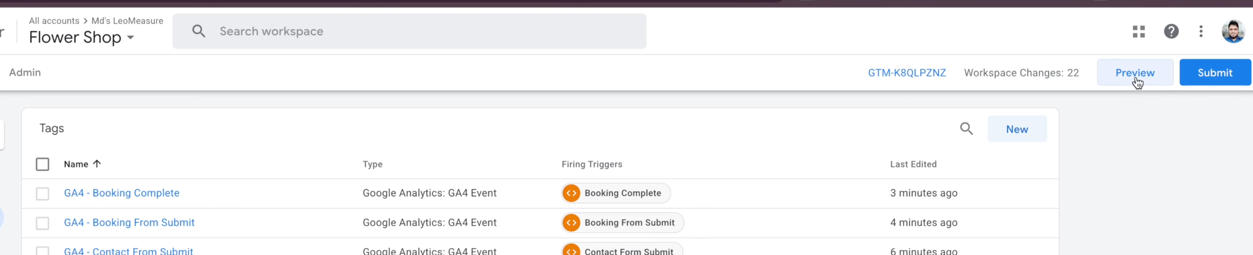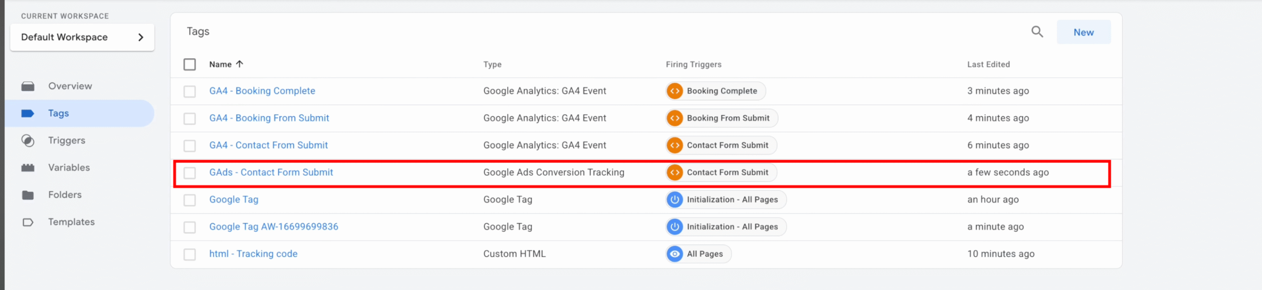 In the GTM Preview, you should see the tag fired as “GAds – Contact Form Submit”.