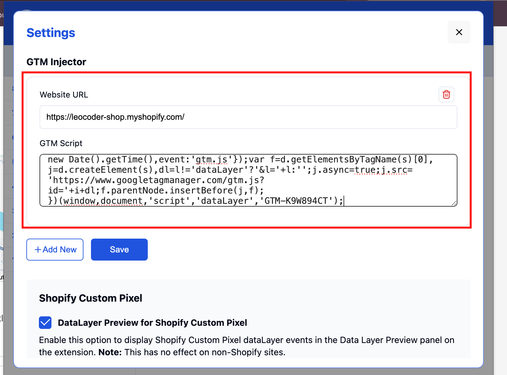 Normally, you would preview the dataLayer using GTM Preview mode. However, due to Shopify’s restrictions, GTM Preview does not work on checkout pages. To work around this limitation, you can install a Chrome extension called “LeoMeasure – DataLayer Checkout & GTM Injector.” After installing you need to go to setting and add a GTM injector with your website url and GTM tracking code like following.